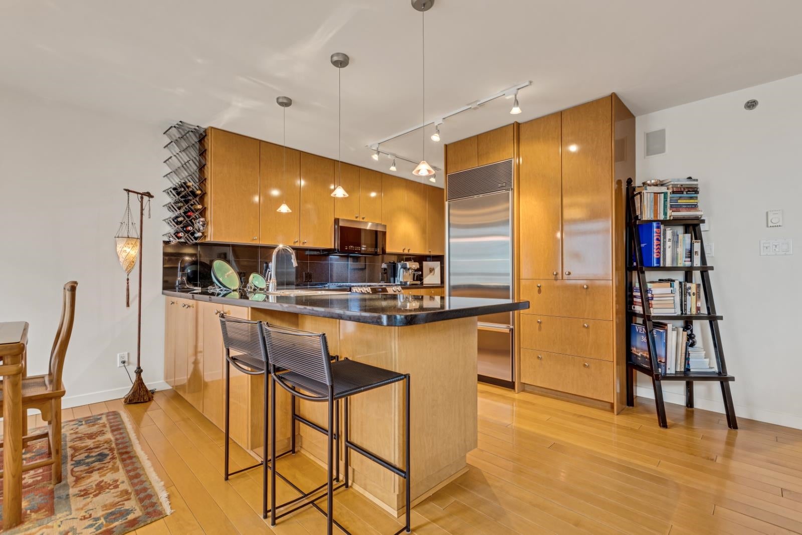 Rarely available 2-level penthouse with stunning views. Bright south exposure with floor-to-ceiling windows on both levels. Main floor features 143 Sqft patio, open-concept living with a cozy fireplace, and a convenient powder room-perfect for entertaining. Upstairs offers a spacious primary bedroom with fireplace and a full ensuite and patio, plus a large second bedroom. Includes 2 parking stalls, 1 locker, and bike locker. Steps to top restaurants, shops & all amenities. A must-see! Open House: Sunday Nov 23, 2-4pm